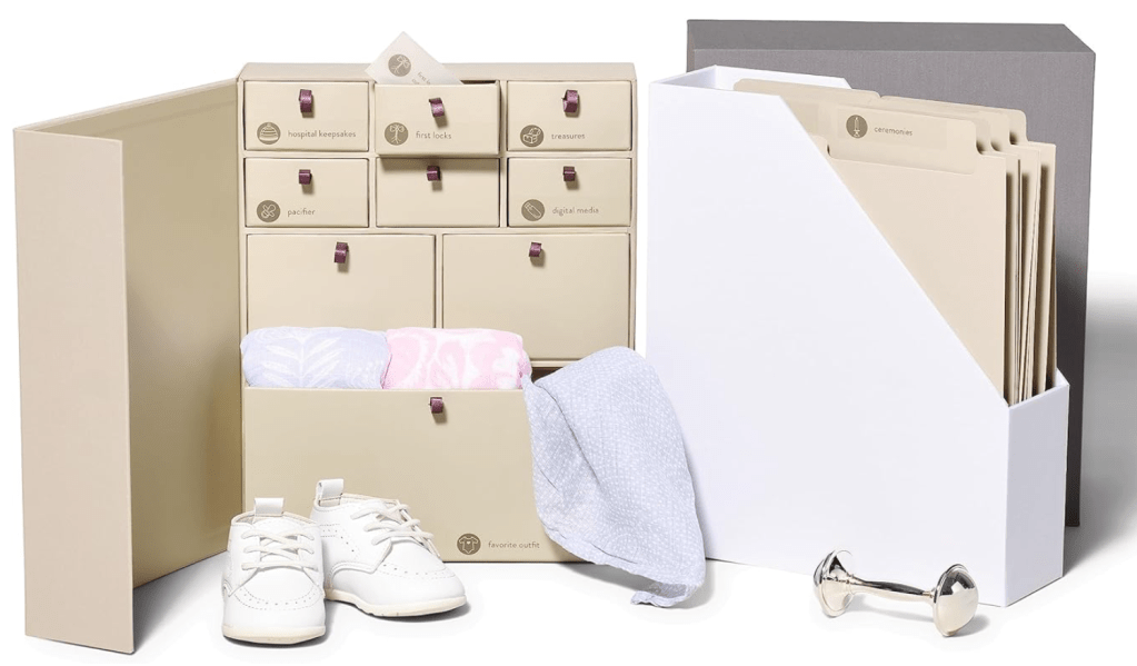 Some wonderful friends got this for us, and it’s such a genius way to keep your baby’s keepsakes. It comes with label stickers so you can customize the compartments and folders and it looks sleek on your bookshelves! Love love LOVE!!